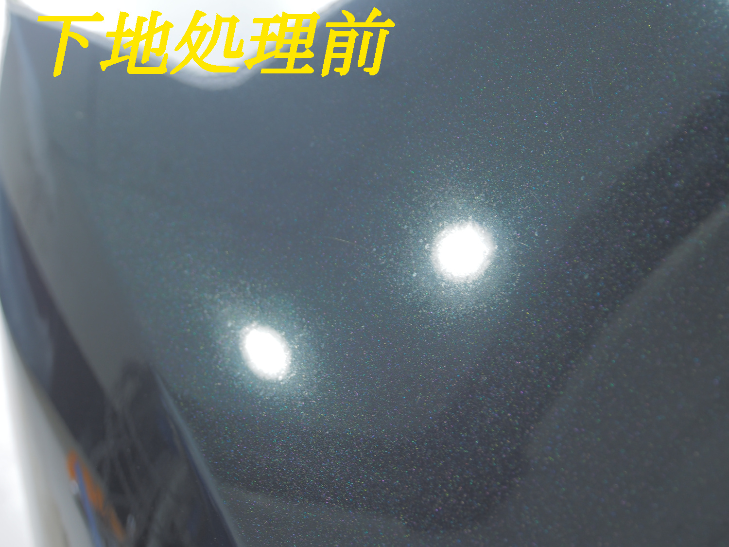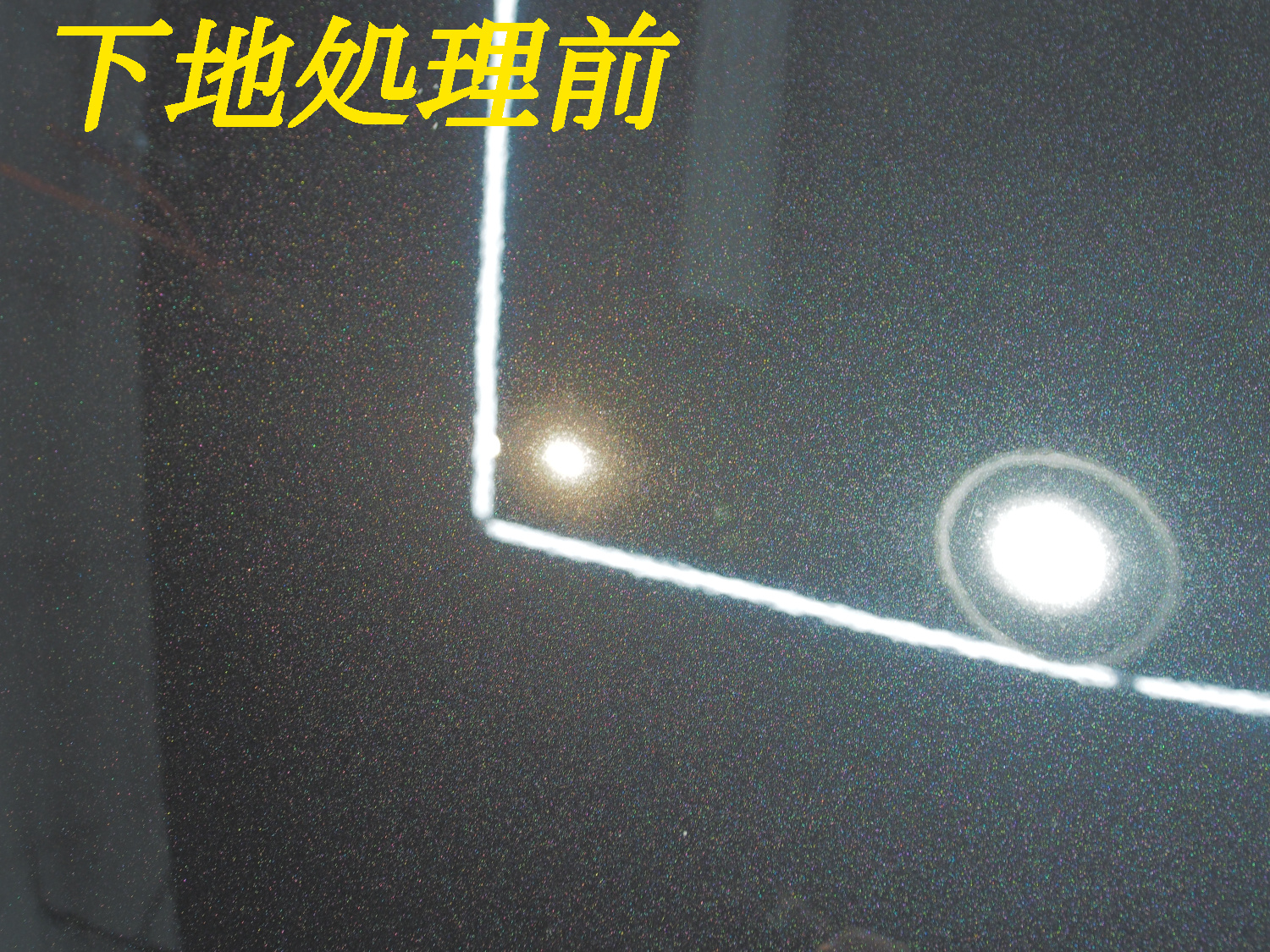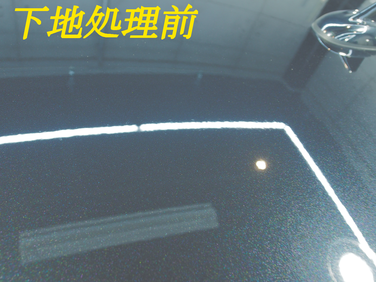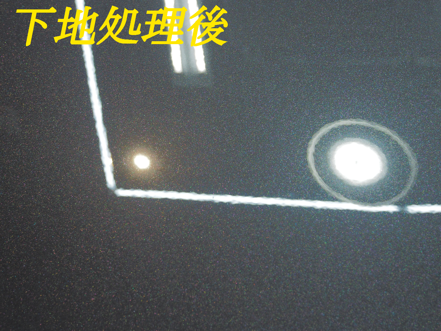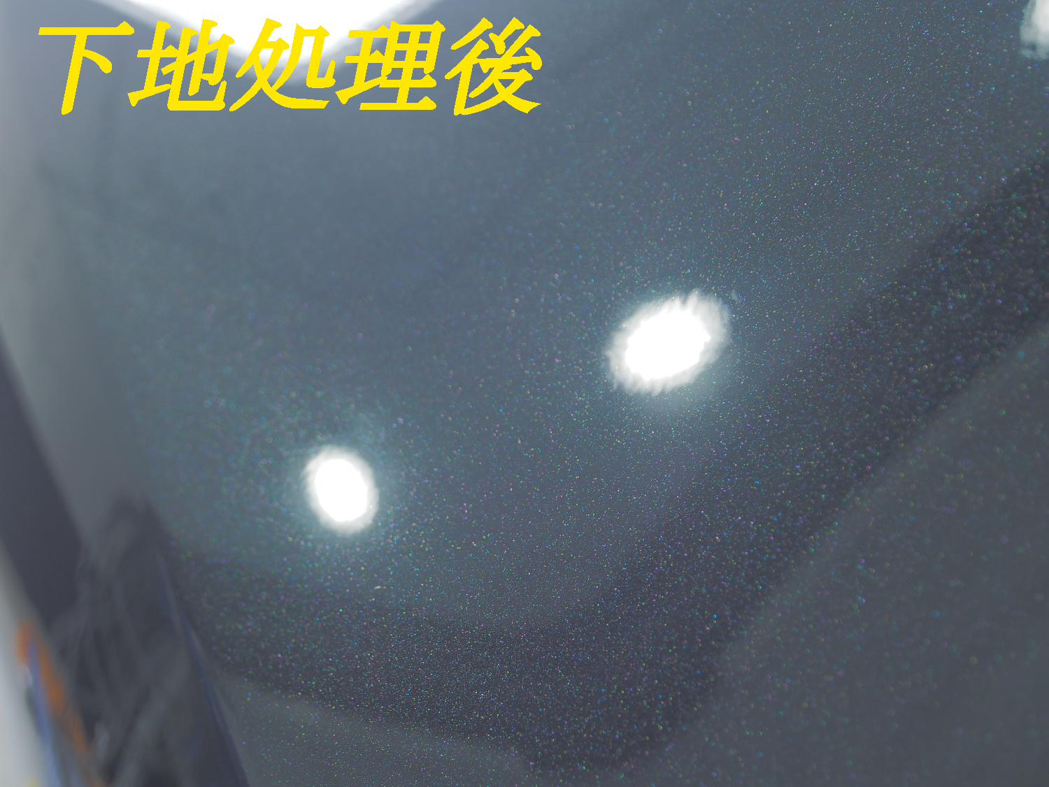 下地処理が完成した塗装面は、とてもクリアな仕上がりとなります。下地処理後はコーティング前に脱脂洗車を行います。リボルト熊本では、洗車に使う水にも拘りをもっております。水道水にはイオンデポジットの原因となるミネラル分が含まれています。水道水から専用のフィルタを通した『純水』をコーティング前の仕上洗車に使用しております。水滴が残らないだけでなく純水洗車した塗装面はクッキリとしたツヤのある仕上がりとなります。