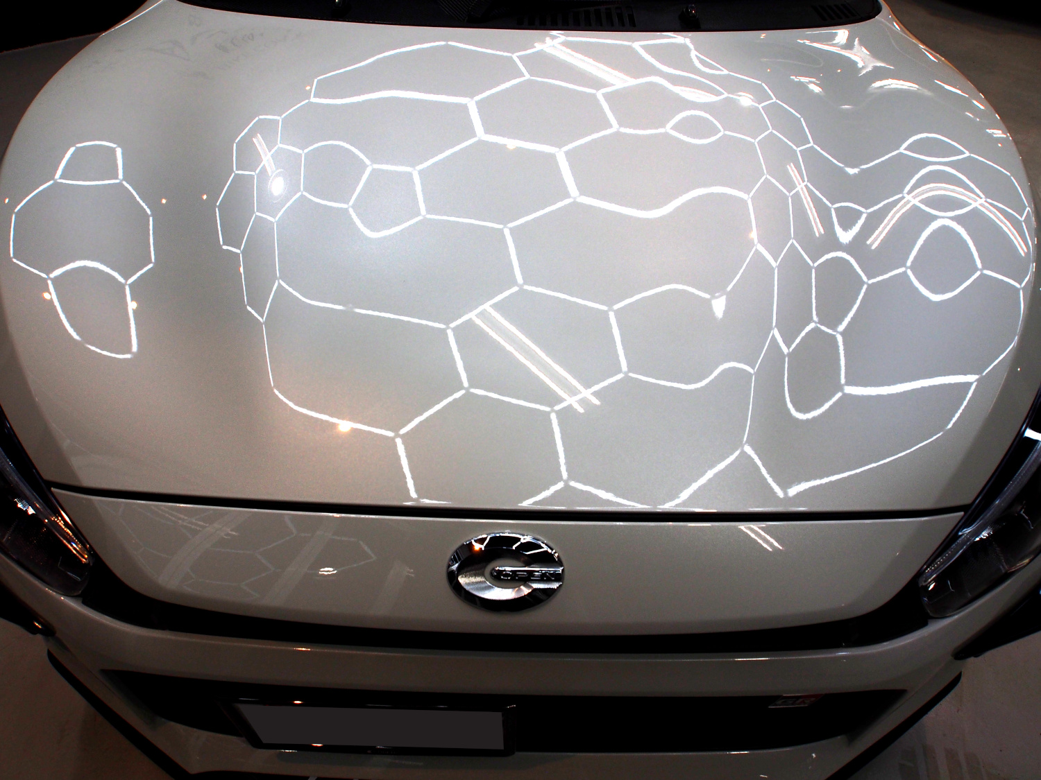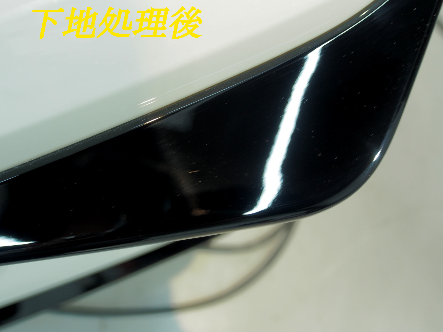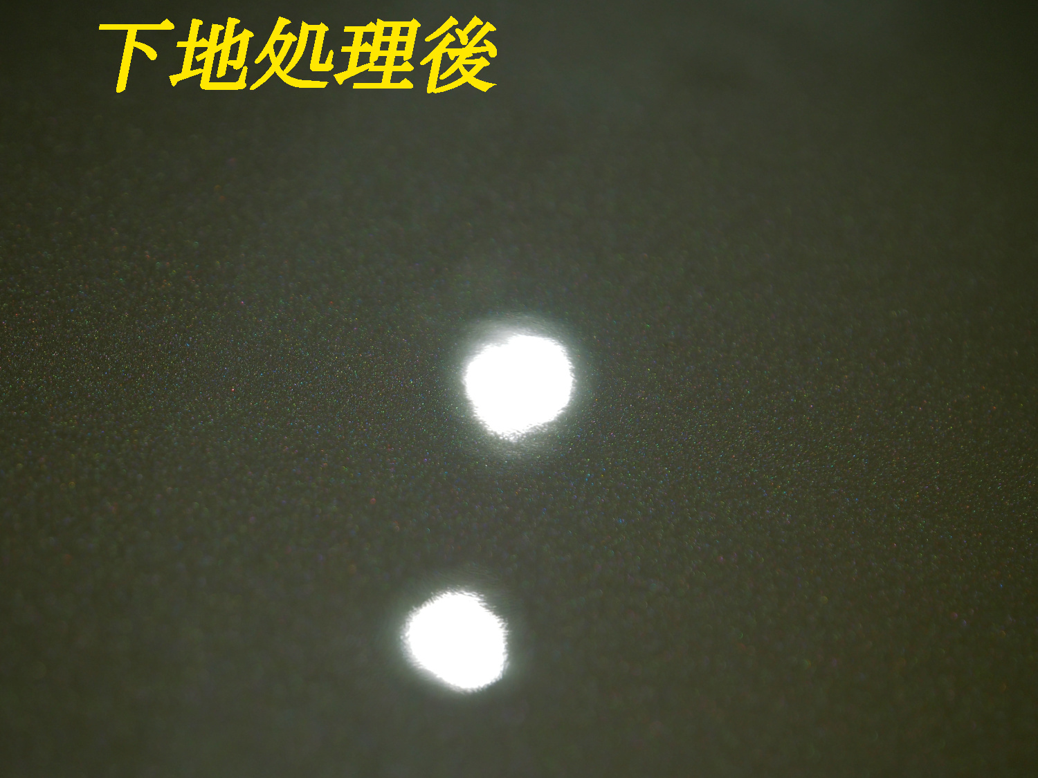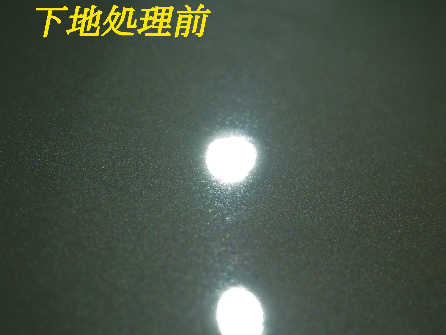 下地処理が完成した塗装面は、とてもクリアな仕上がりとなります。下地処理後はコーティング前に脱脂洗車を行います。リボルト熊本では、洗車に使う水にも拘りをもっております。水道水にはイオンデポジットの原因となるミネラル分が含まれています。水道水から専用のフィルタを通した『純水』をコーティング前の仕上洗車に使用しております。水滴が残らないだけでなく純水洗車した塗装面はクッキリとしたツヤのある仕上がりとなります。