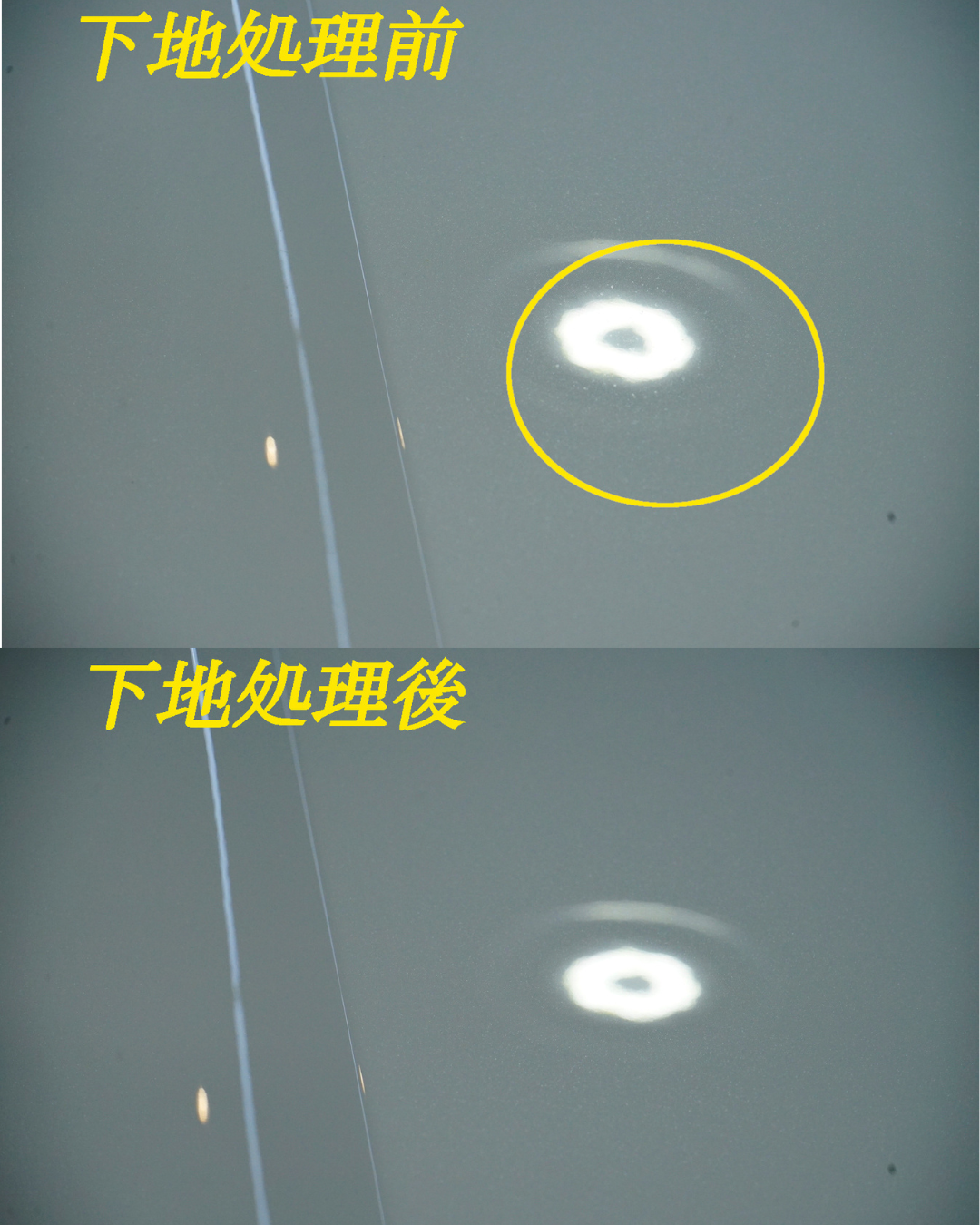 この部分は塗装の特性上、研磨の際に熱やバフ圧の管理を誤ると傷を増やしてしまうため、