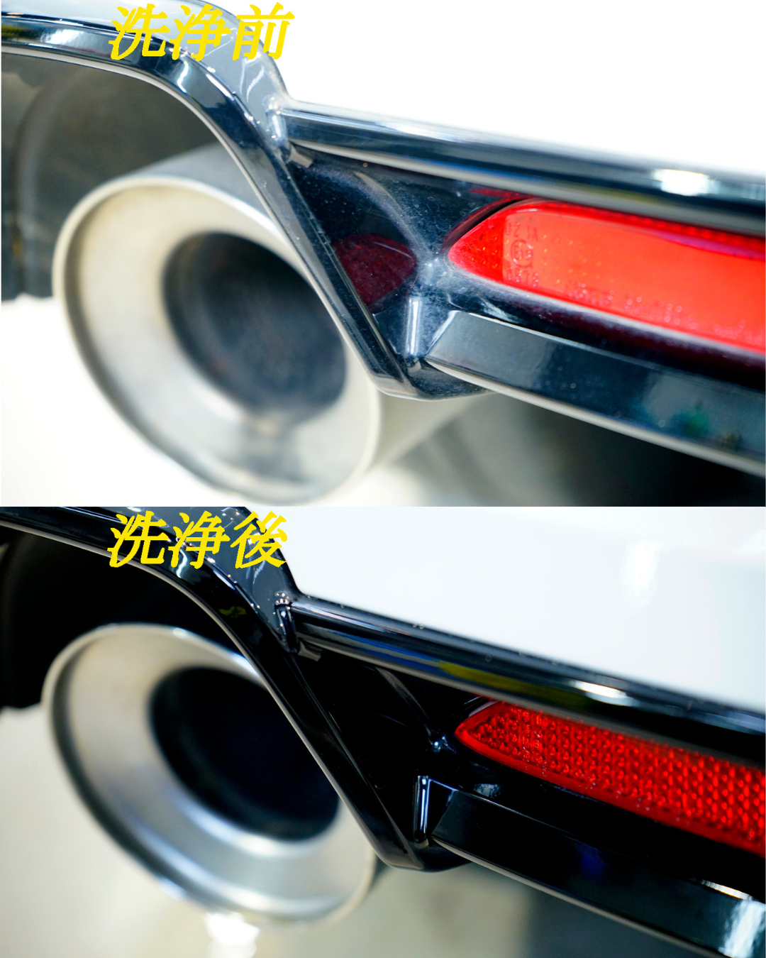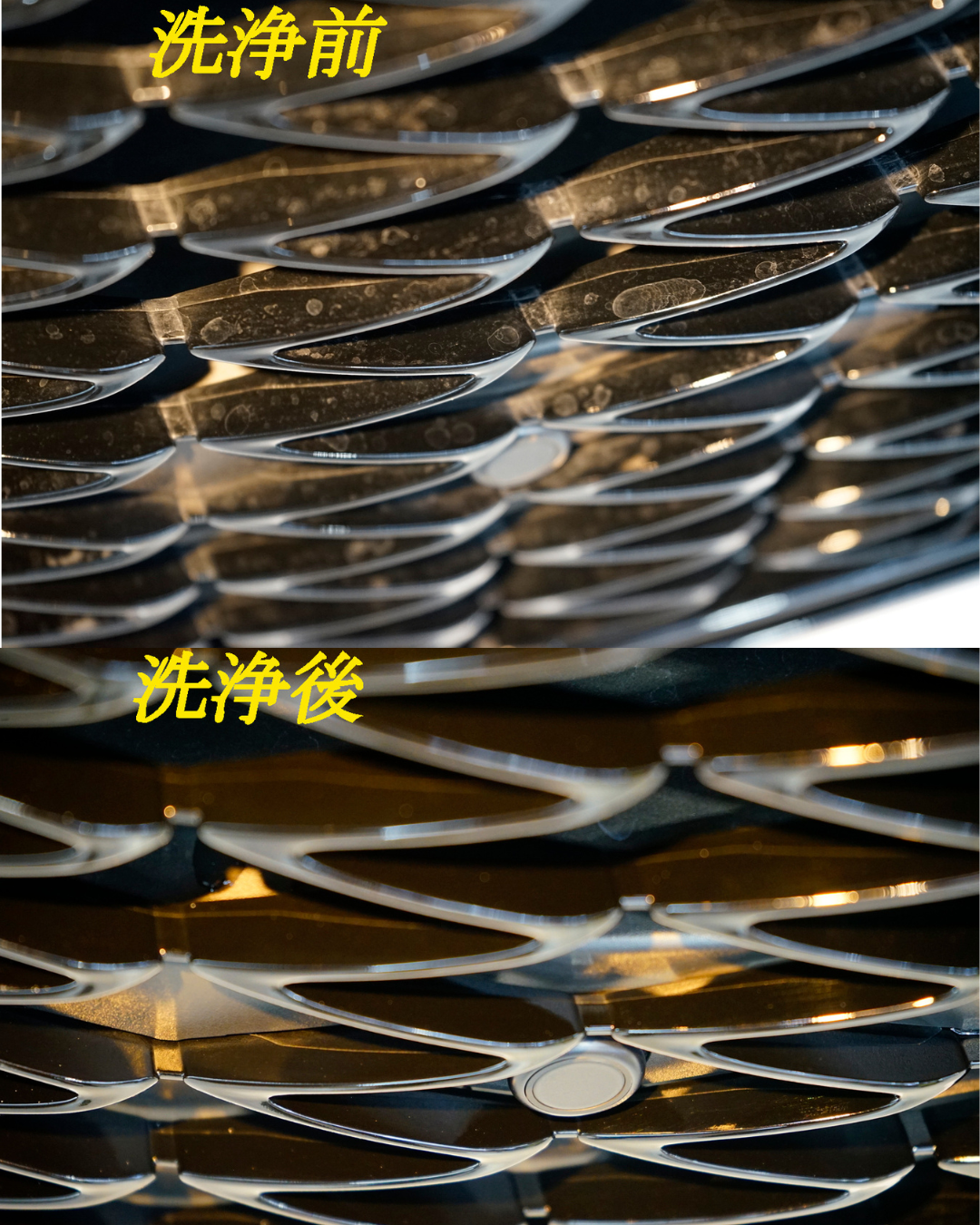 汚れが蓄積されやすいフロントグリルやパネルの隙間、ドア内側の水垢も丁寧に一つずつ除去。