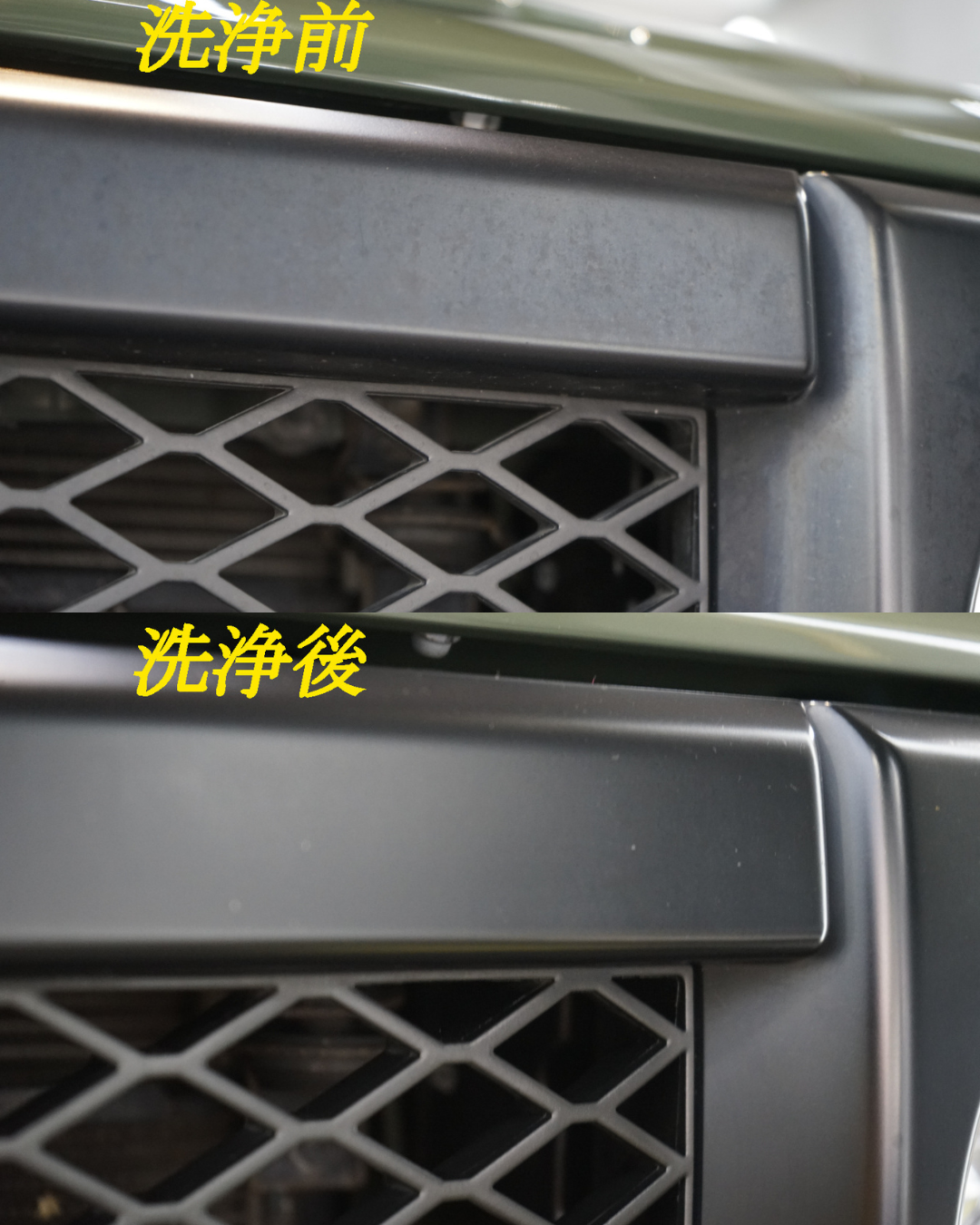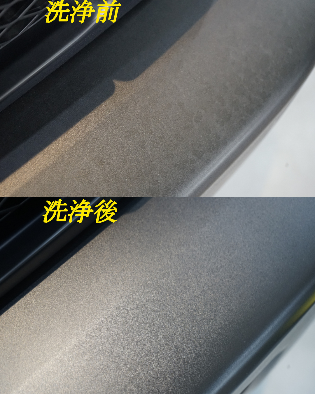 また、白ボケしていた未塗装樹脂部分にも専用のケミカル処理を実施。劣化した表面を整えたうえでしっかりと色味を復元し、引き締まった印象へと仕上げていきます。