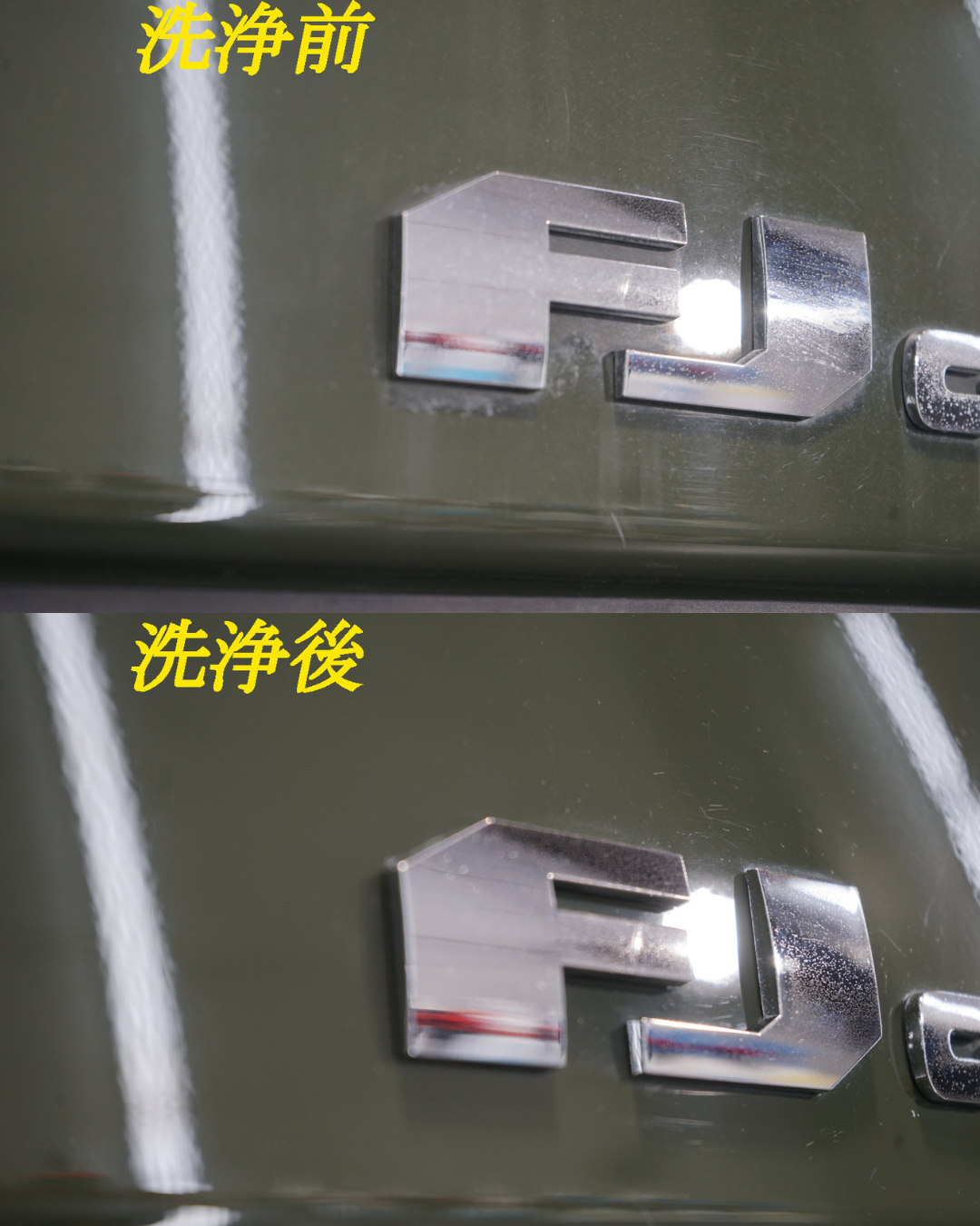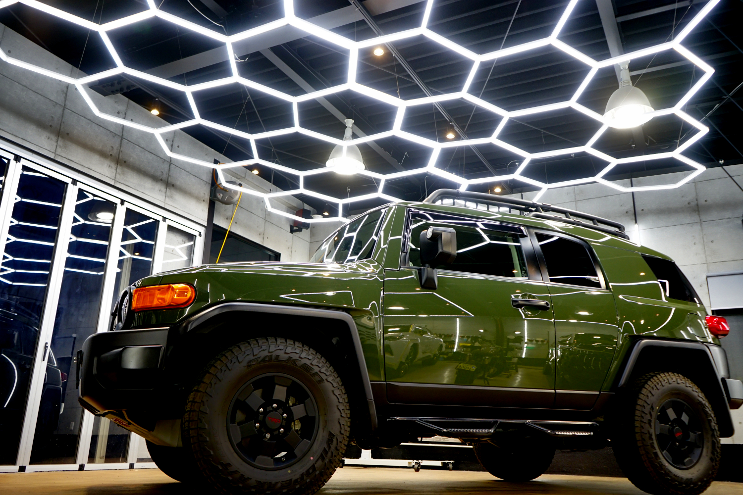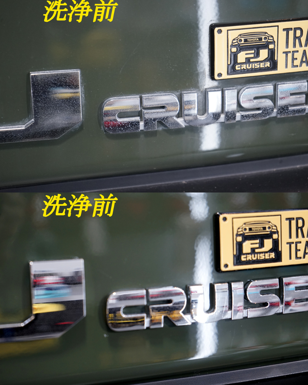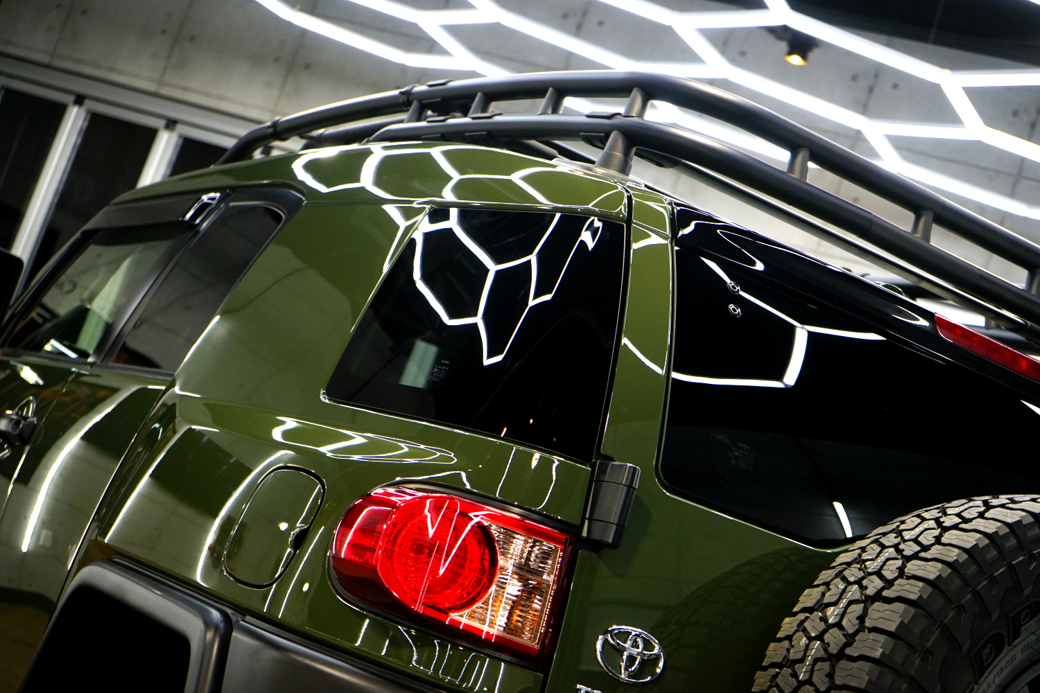 施工後は、これまでぼやけていたボディが一変。光の反射が整い、輪郭がはっきりと浮かび上がるようなシャープな印象へと変化しました。無骨で力強いFJクルーザーのデザインが、より際立つ仕上がりとなっています。