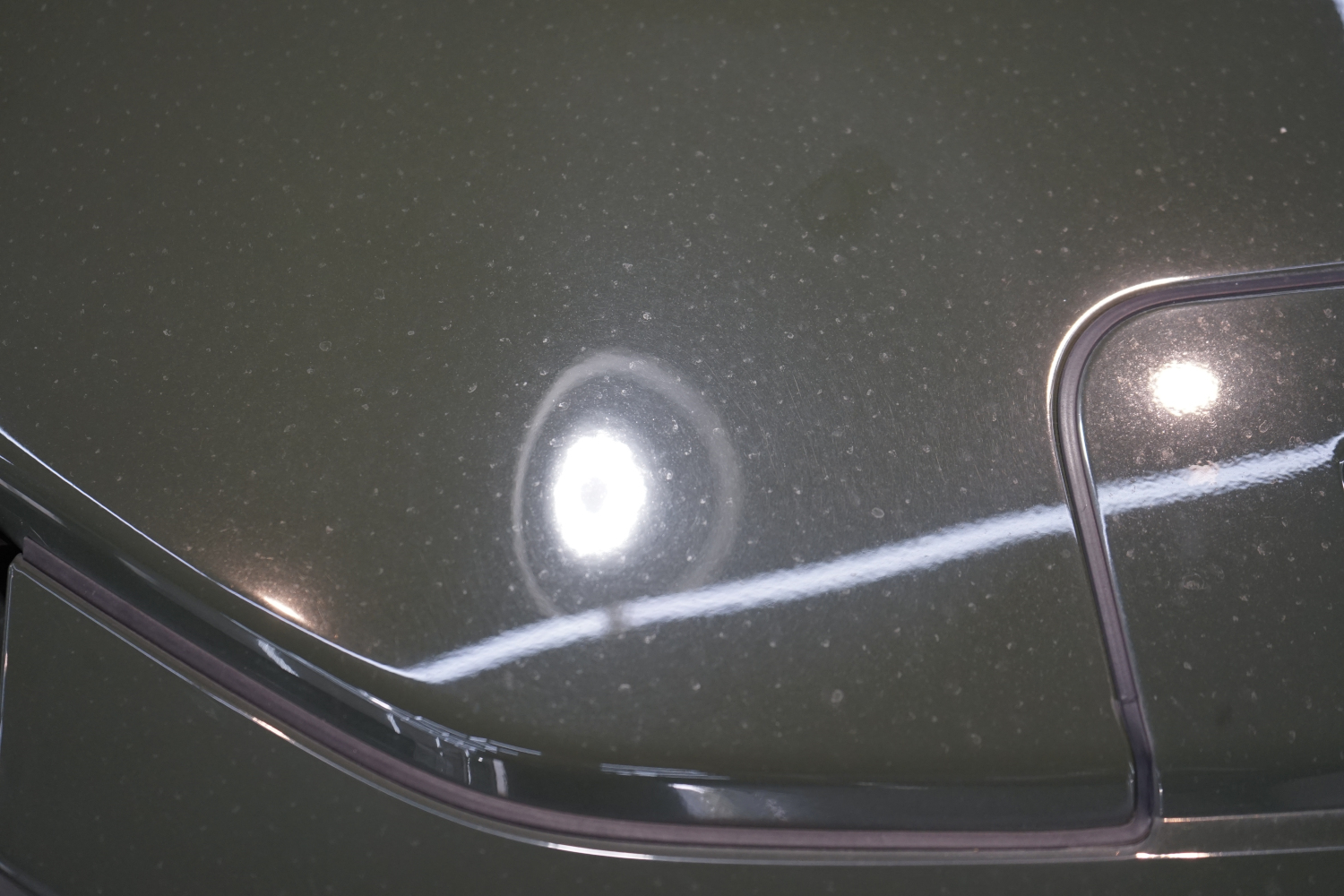まず全体をチェックしていくと、ボディには無数の洗車キズと水シミが広範囲に確認できました。特にルーフやボンネットといった水平面には、雨ジミが固着し塗装の光沢を大きく損なっている状態です。